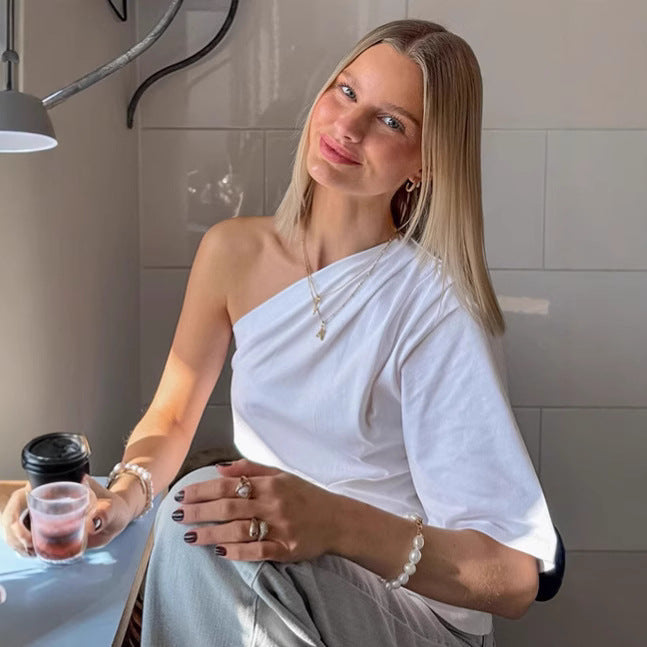 French White Irregular Asymmetric off the Shoulder Short Sleeve Knitted Pullover T shirt for Women