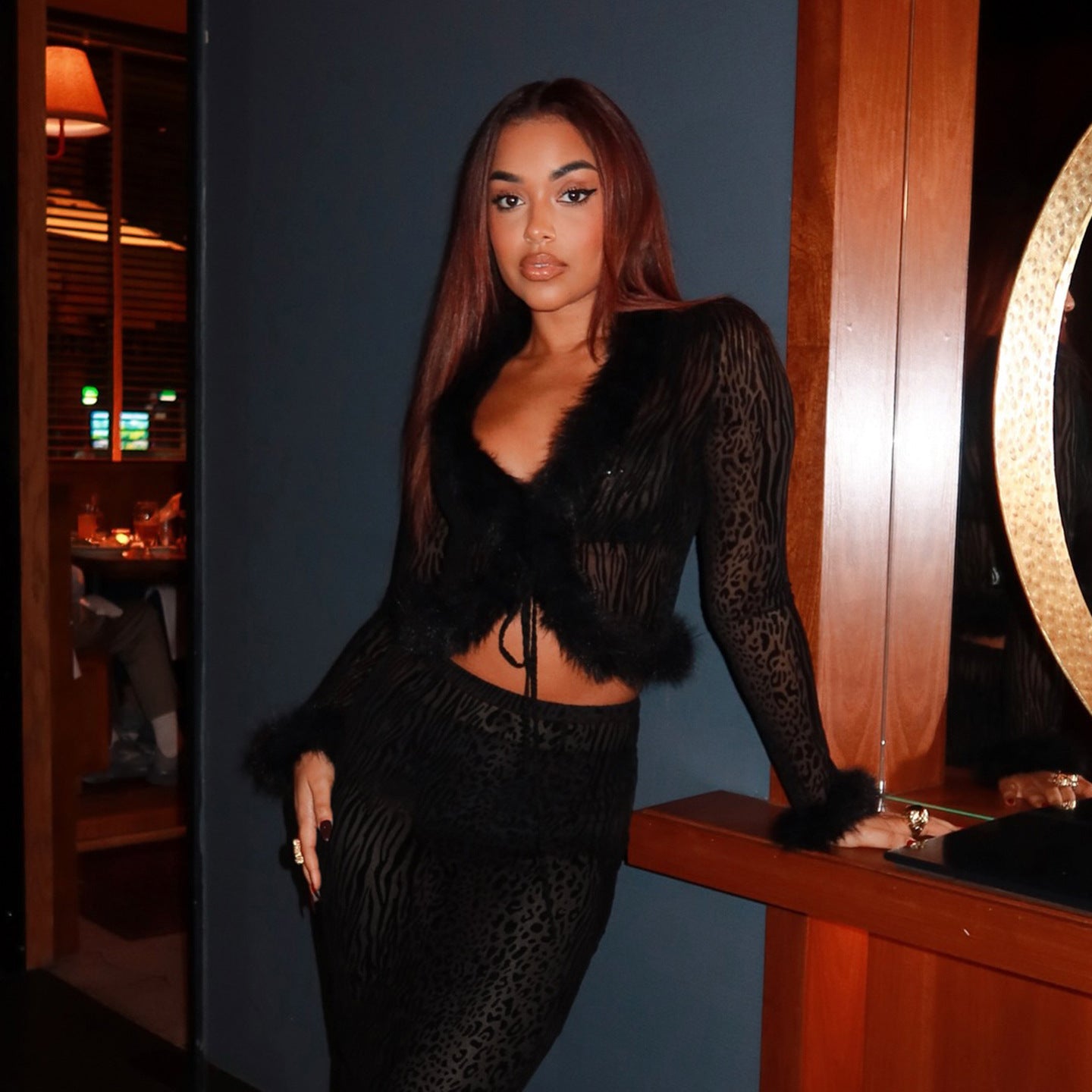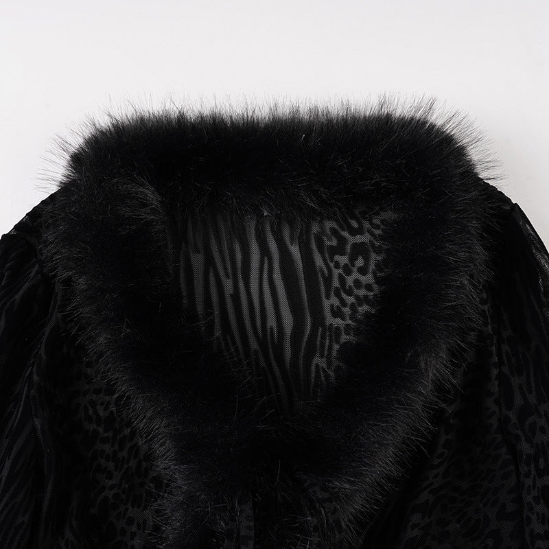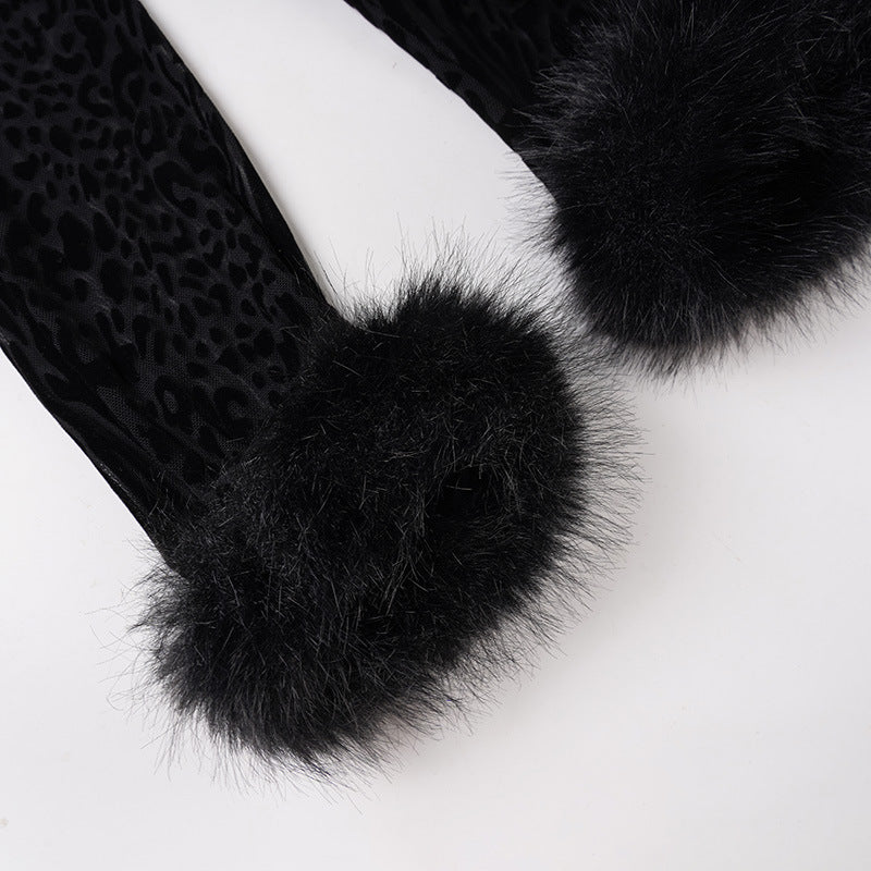 Celyne Sexy Flocking Wool Tops Lace up Cardigan Leopard Print Skirt Women Fur Stitching Two Piece Sets
