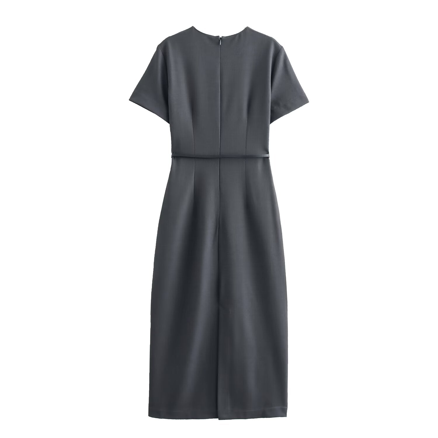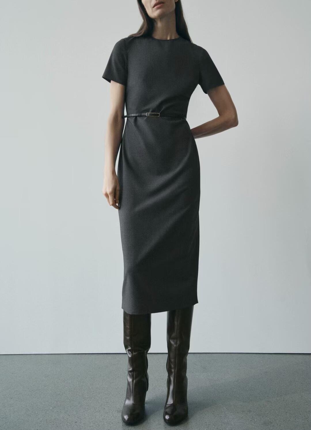 Women Clothing Winter round Neck Short Sleeve Belt Solid Color Business All Matching Dress