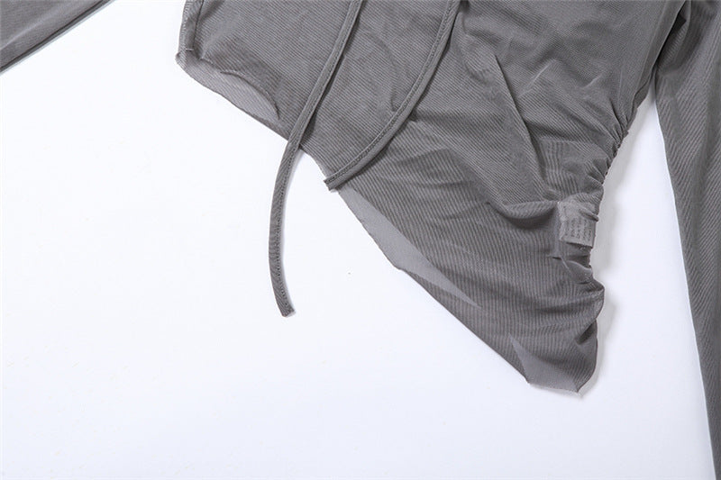 Spring Women Clothing Long Sleeve Square Neck Slim Fit Cropped Voile See Through T Shirt