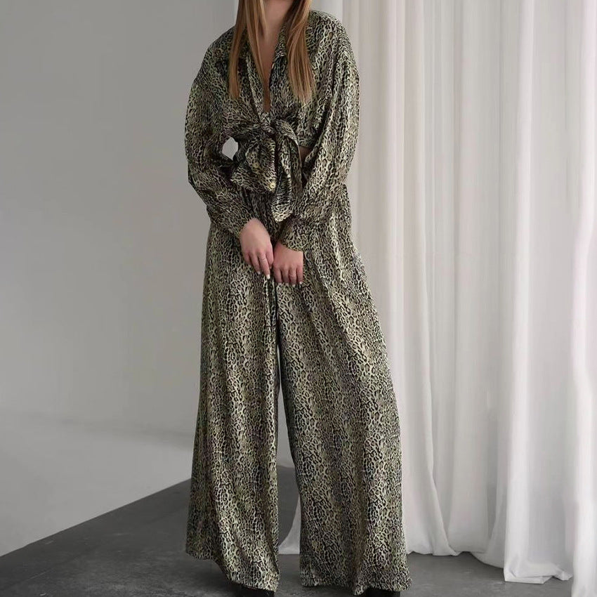 Fall Leopard Print Printed Loose Long Sleeves Trousers Suit Two Piece Set Women