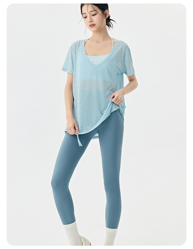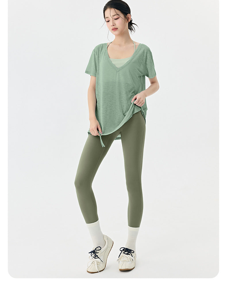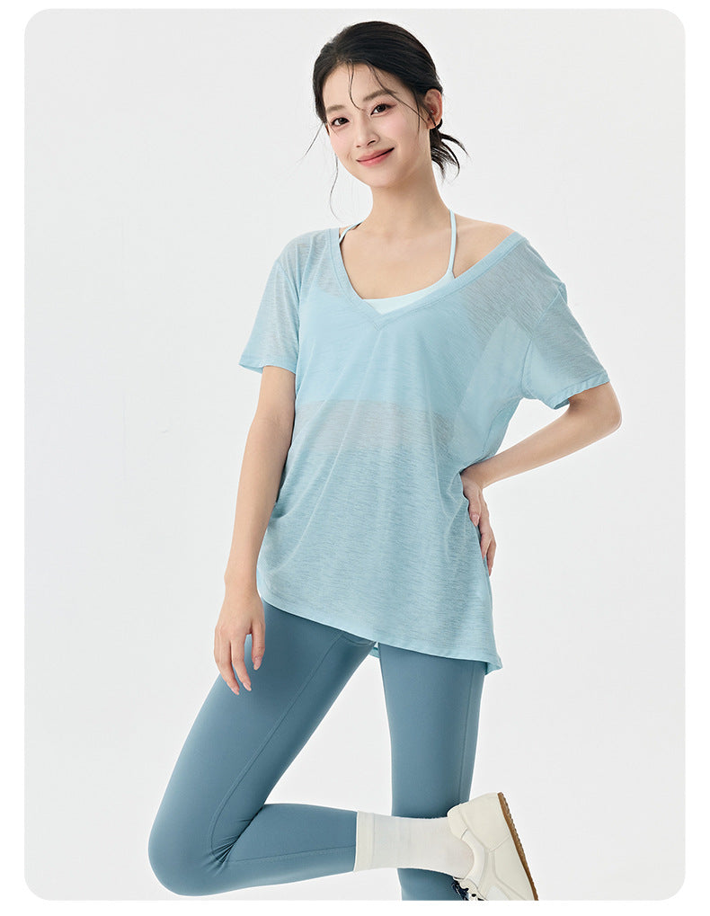 Summer Side Pleating Sports Blouse Women Hip Covering Loose Casual Yoga T shirt Big Neckline Thin Workout Clothes
