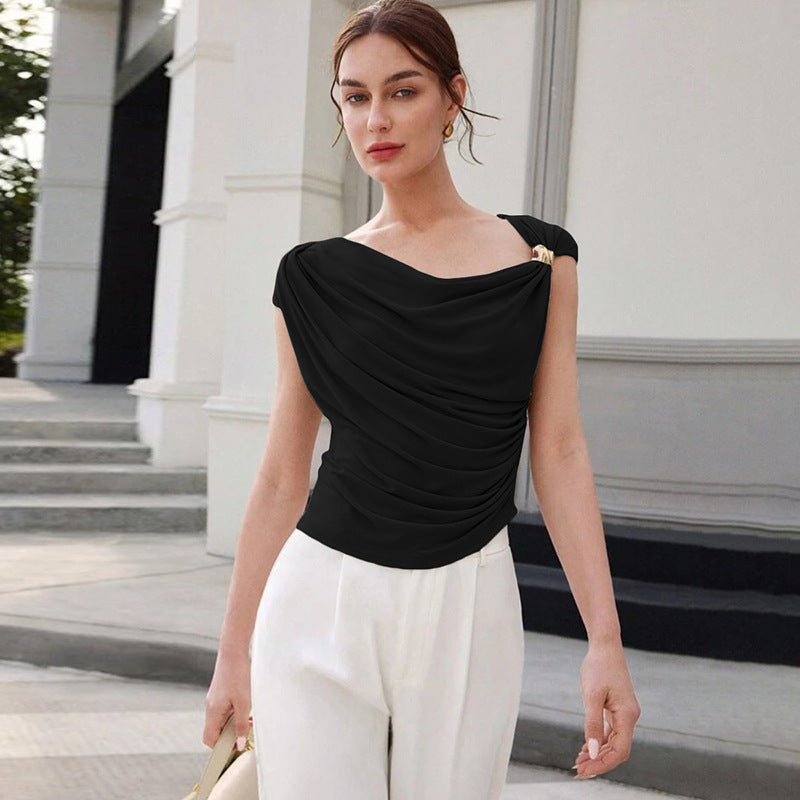 Summer Women Clothing Solid Color Simple Personality Diagonal Collar Sleeveless Cinched Slimming Pullover Women