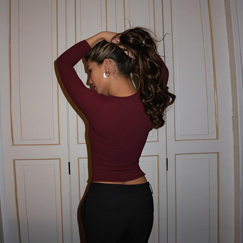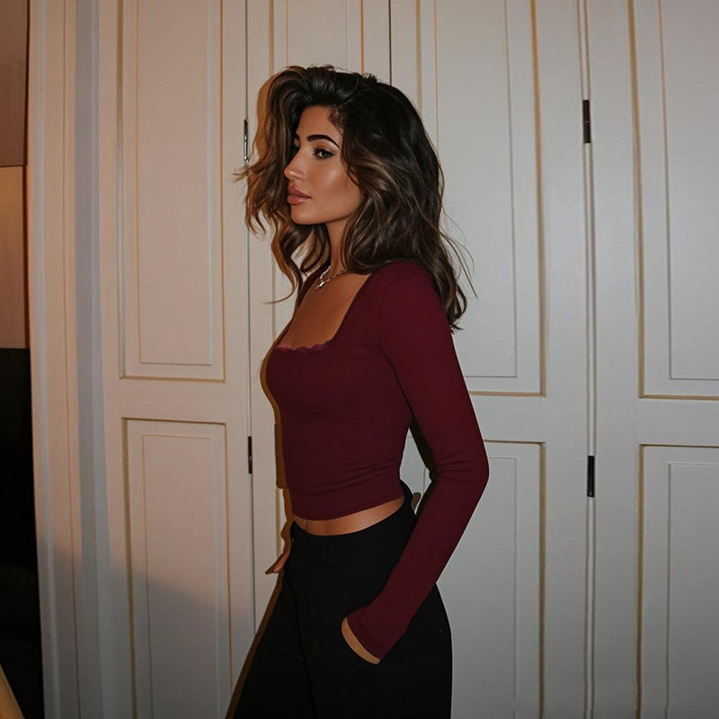 Square Collar Top Autumn Winter Slim Fit Slimming Long Sleeves Office All Matching T shirt